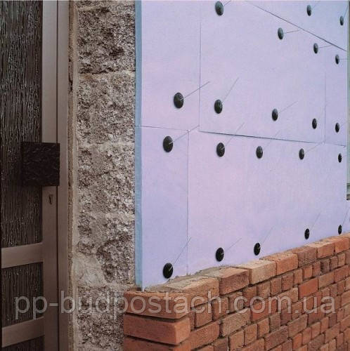 - Проводиться додаткове закріплення плит спільно з армованою сіткою за допомогою довгих пластмасових тарілчастих дюбелів. Витрата дюбелів на кожну плиту становить п'ять штук – один в центрі, решта по кутках. Для економії допускається закріплення крайніми дюбелями відразу двох сусідніх аркушів.