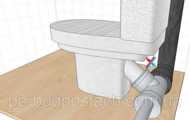 Після закріплення унітаза на підставі наступає година його з'єднання єднання із зовнішнім світом ― з випуском каналізаційної труби. На випуску унітаза можна виявити спеціальні канавки. Їх потрібно промастити розведеним в оліфі суриком і щільно обмотати смоляним пасмом. Потім випуск унітаза вставляють у попередньо очищень отвір каналізаційного відводу й законопачують кільцевий зазор джгутиками із лляної пряжі. Після цього шов зашпаровують цементно ― піщаним розчином.